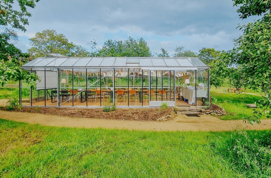 Inspírese en nuestro encantador invernadero, enclavado en el corazón de nuestro huerto. Este invernadero tiene capacidad para 20 personas para reuniones. Está equipado con wifi, una gran pantalla de televisión con todas las conexiones necesarias y un rotafolio. Los usuarios del invernadero también pueden utilizar la zona cubierta/carpa, con capacidad para 40 personas.