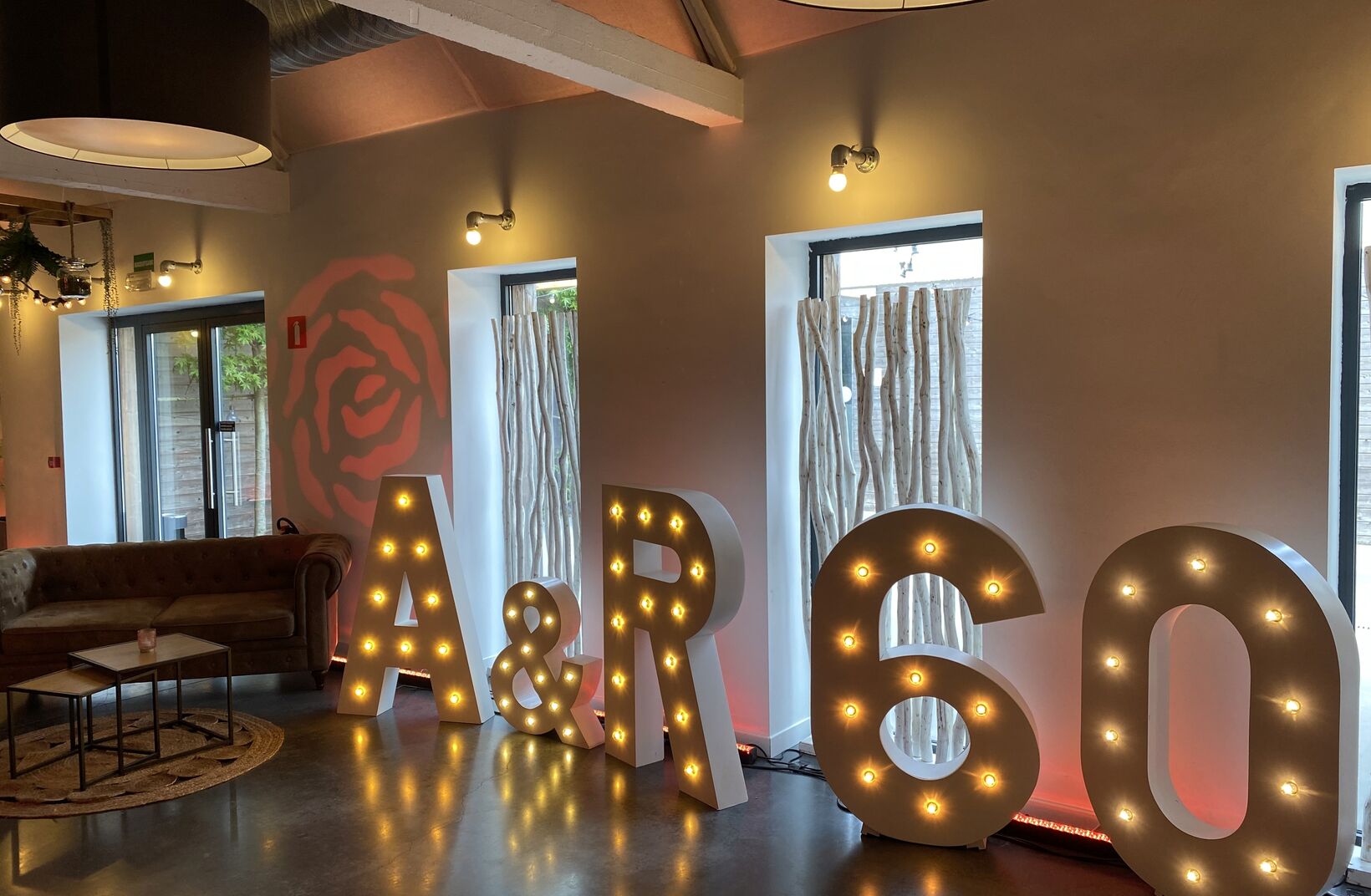 Para el sexagésimo aniversario de bodas de André y Rachel, proporcionamos esta configuración con una combinación de asientos clásicos (mesas cruzadas y redondas), mesas altas con taburetes y un salón de terciopelo. El rosa era el color objetivo.