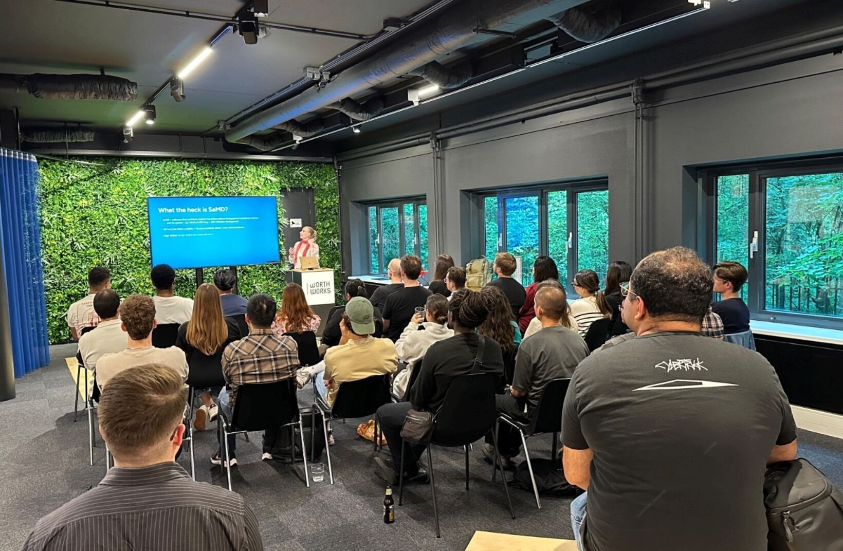 On September 18, 2025, Worth Works hosted the Lean UX community for their fourth Thirsty Thursday meetup in our space. The evening kicked off with pizza and drinks in the bar area before everyone moved into the main hall for three “tiny talks” on data-driven design, health tech UX, and accessibility.